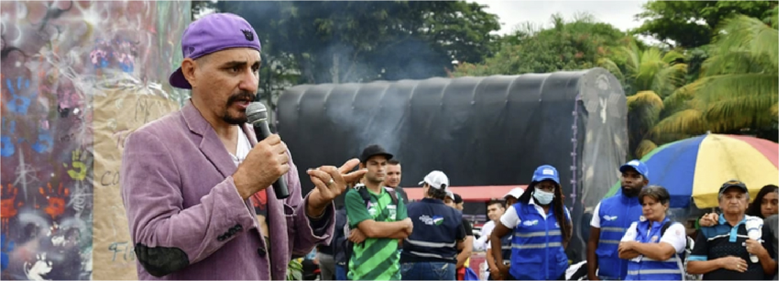 Este fue el caso de Rolando Quintero, conocido como el “Profe Papas”, docente y líder social que participó en los bloqueos de Puerto Resistencia en Cali, donde coordinaba un restaurante comunitario.
