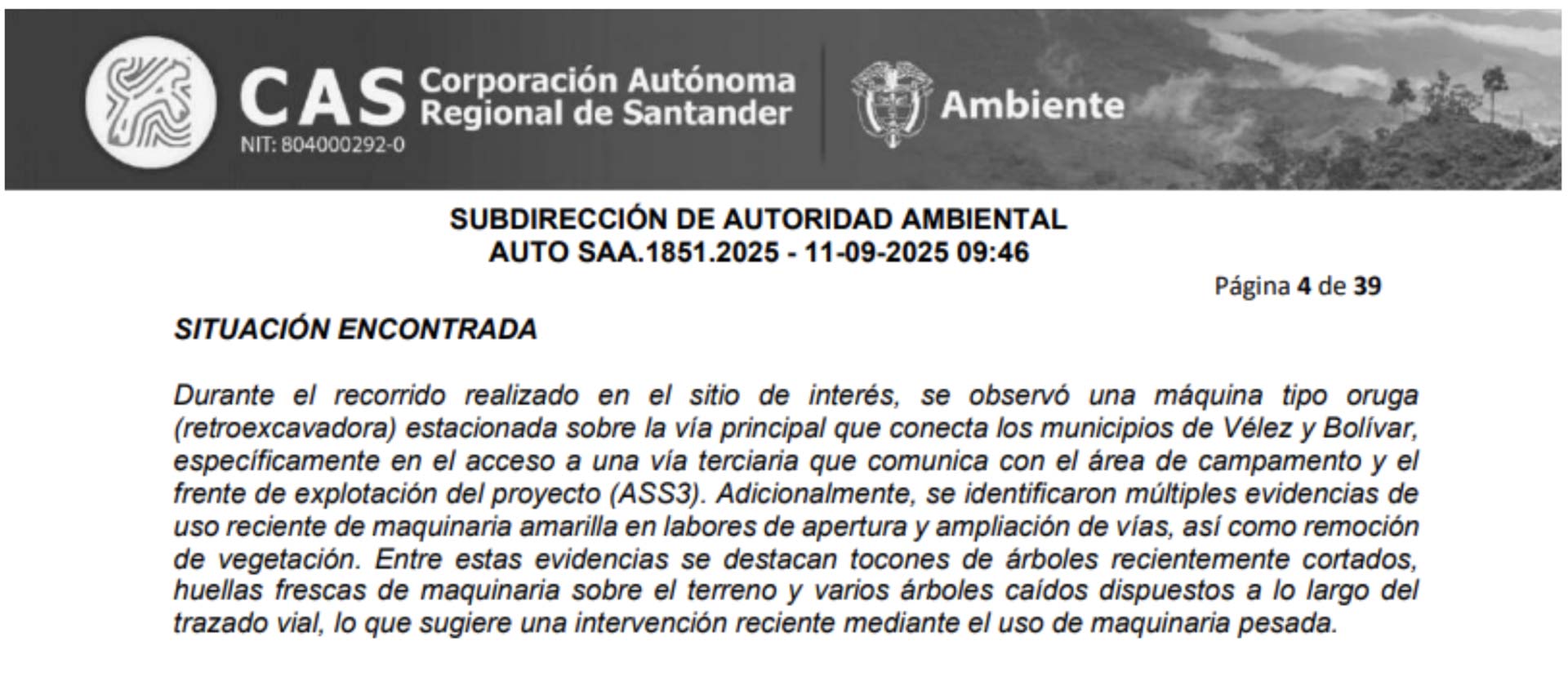 La Corporación Autónoma visitó el terreno el 12 de mayo y se encontró con un escenario preocupante. El informe de la autoridad ambiental en poder de Baudó establece que  se “identificaron múltiples evidencias de uso reciente de maquinaria amarilla en labores de apertura y ampliación de vías, así como remoción de vegetación […] se destacan tocones de árboles recientemente cortados, huellas frescas de maquinaria sobre el terreno y varios árboles caídos dispuestos a lo largo del trazado vial, lo que sugiere una intervención reciente mediante el uso de maquinaria pesada […] se hallaron troncos dispersos en el área, lo que indica el aprovechamiento forestal reciente de individuos arbóreos, probablemente durante las actividades de adecuación del terreno. Es importante señalar que el terreno aledaño al área intervenida presenta originalmente una cobertura vegetal arbustiva bien conservada […] madera encontrada en el sitio estaría siendo utilizada para diferentes adecuaciones dentro de la actividad minera, como la construcción de áreas destinadas al almacenamiento de herramientas”.